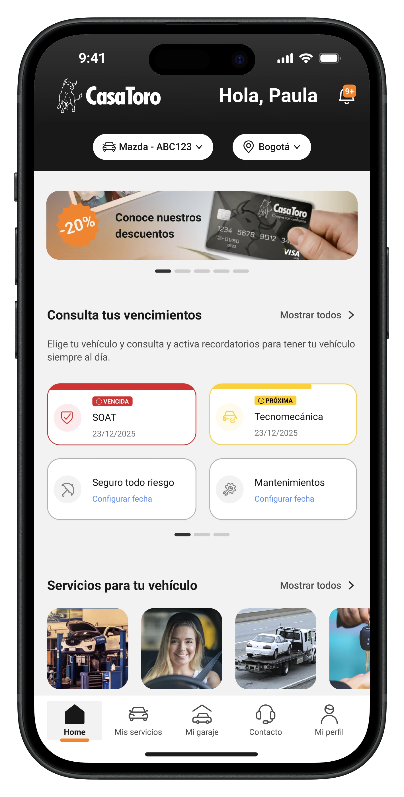 Gestiona todo lo importante de tu vehículo en un solo lugar, desde recordatorios y servicios hasta contacto directo con tu concesionario.